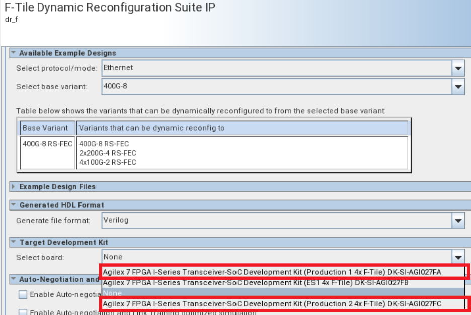 Similar programming (SOF) file generation problem you may observe when you generate the F-Tile Dynamic Reconfiguration Suite IP Example Designs by selecting Target Development Kit with option 1) Agilex™ 7 FPGA I-Series Transceiver-SoC Development Kit (Production 1 4xF-Tile) DK-SI-AGI027FA or 2) Agilex 7™ FPGA I-Series Transceiver-SoC Development Kit (Production 2 4xF-Tile) DK-SI-AGI027FC. As shown in the figure below.