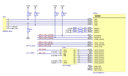 Hi, We are trying to program an Agilex 3 device over the AVST8 interface, implemented through a CPU using SPI and bit-banging. Setup (see picture below): Data is shifted into a serial-to-parallel converter via SPI. AVST_CLK is generated from the SPI CS signal. AVST_VALID and AVST_READY are controlled by GPIOs. With this setup, we can mimic the passive serial programming approach used on Arria FPGAs. What works: Programming and testing over JTAG works fine. The FPGA design itself runs correctly. What does not work: During AVST8 programming, AVST_READY goes low after ~8210 bytes and never returns high. Programming sequence we follow: CPU initializes pins: nCONFIG=0, AVST_VALID=0 CPU sets nCONFIG=1 FPGA pulls nSTATUS=0 CPU sets nCONFIG=0 FPGA sets nSTATUS=1 CPU provides some clock cycles (~81 cycles) on AVST_CLK (since AVST_READY is low) FPGA sets AVST_READY=1 CPU sets AVST_VALID=1 and streams configuration data After 8210 cycles, FPGA sets AVST_READY=0 CPU sets AVST_VALID=0 and continues clocking At this point, AVST_READY never goes high again. What we observed: If we deliberately corrupt the configuration data, nSTATUS goes low after a few cycles — as expected. This suggests that the FPGA is checking data integrity, but something prevents AVST_READY from recovering. Our bit-banged AVST_CLK frequency is only about 60 kHz. Could this low frequency be the root cause? Question: Why does AVST_READY stay low after 8210 bytes? Is the slow clock (60 kHz) causing the issue, or are we missing something in the programming sequence? Thanks in advance for your support!Solved1.6KViews0likes6Comments10AS032H2F34I2LG SPI1 master controller to TPM SLB9672 SPI communication