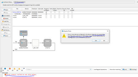 Hi, i'm using DK-DEV-AGI027RBES devkit, The board switches are configured as follows, trying to refresh the Agilex7i *.jic file using my design with hps. A while ago i flashed a golden reference *jic via an embedded jtag (J8) and see yocto boot. The same ghrd *.jic reprogramming is blocked by some devices in the JTAG chain. Can you provide steps on how to reprogram *.jic/ghrd *.jic? SW1=ON/Off/Off/Off; SW2=ON/Off/Off/Off; SW3=Off/ON/ON/Off; SW4=Off/Off/ON/Off; SW5=Off/Off/Off/Off; SW8=Off/Off/Off/Off NOTE: I tried flashing the GHRD *.JIC using the devkit embedded USB blaster and I saw the same popup and stopped me from loading the JIC. Also, although *.sof is being programmed, "Error (20064): Error status: Unable to set chip select" always appears. What does it mean? Why am I getting this error? Thanks, Shivaji M1.1KViews0likes4Comments