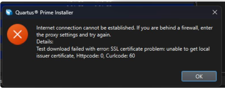Why does my Quartus® Prime Installation fail with certificate error: SSL certificate problem: unable to get local issuer certificate (curlcode 60)?
