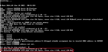 Hi, I am getting an error loading/debugging uboot through the Arm Development Studio debugger on my custom Arria 10 Han Pilot board that boots from QSPI Flash. I am following the instructions here for building the preloader and uboot from the custom Quartus project handoff xml file: https://www.rocketboards.org/foswiki/Documentation/BuildingBootloaderCycloneVAndArria10#Arria_10_SoC_45_Boot_from_QSPI I created a debugger script per the instructions in that same document located here: https://www.rocketboards.org/foswiki/Documentation/BuildingBootloaderCycloneVAndArria10#Arria_10_SoC_45_Debugging_U_45Boot When I run the script in the debugger, everything seems to work up to the point where u-boot gets loaded. When that happens, I get the following error: +loadfile u-boot-socfpga/u-boot Target Message: Memory access caused precise abort. Debug Precise Abort Registers : DFSR = 0x00000805, DFAR = 0x01001020 ERROR(CMD16-TAD59-NAL18): # in C:\Users\engineering\HD-MRPS\Linux_Boot\11-18-2023\debug-u-boot-A10.ds:27 while executing: loadfile u-boot-socfpga/u-boot ! Failed to load "u-boot" ! Download of 356,184 bytes to address S:0x01000040 failed while writing block of 4,096 bytes to address S:0x01000040 ! Bus error on memory operation.ERROR(CMD656): The script C:\Users\engineering\HD-MRPS\Linux_Boot\11-18-2023\debug-u-boot-A10.ds failed to complete due to an error during execution of the script I checked that memory address in the debugger and verified that it is not writable (all red). This error seems to indicate that the preloader did not correcly initialize the memory for some reason. I also do not get any output form the serial terminal while the preloader executes which indicates that the IO is not configured correctly either. I have attached the debugger script I am running and the corresponding error log. I can replicate this error on my Han Pilot Arria 10 dev kit that is configured to load from an SD card. With this setup, I follow these instructions for building the preloader and uboot: https://www.rocketboards.org/foswiki/Documentation/BuildingBootloaderCycloneVAndArria10#Arria_10_SoC_45_Boot_from_SD_Card It seems like the qts-filter_Arria10.sh script does not import all of the necessary configuration differences of the custom board to the bootloader build environment. It also seems that the Han Pilot dev kit is different that the Intel Arria 10 dev kit and those differences don't get imported by the qts-filter_Arria10.sh either. I researched the Forums for similar issues and I found this thread where the preloader was not configuring the memory and IO correctly for a custom board, but the solution was never posted to the board even though the problem was apparently solved. Here is that thread: https://community.intel.com/t5/Intel-SoC-FPGA-Embedded/Preloader-uboot-SPL/td-p/1478716/page/2 Do any Intel employees involved with that thread happen to know what the solution to that problem was? I would appreciate any help you can provide with this issue. Thanks, Richard4.8KViews0likes10CommentsIntel Arria 10 SOC QSPI boot Stuck