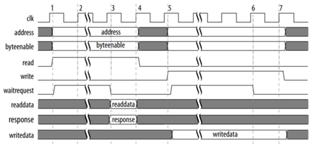 Overview This article is written for beginners who have just started developing Field Programmable Gate Arrays (FPGAs) with IntelĀ®, especially those who have started to use the Platform Designer in IntelĀ® QuartusĀ® Prime Software but are not quite sure about the interfaces of Intellectual Property (IP). While there are various types of AvalonĀ® Interfaces (please refer to this page), this article introduces the frequently used AvalonĀ® Memory-Mapped Interfaces and also explains the Avalon Verification IP Suite used for signal verification. Specifically, for AvalonĀ® Verification IP Suite, you can download the test benches by clicking on Avalon Verification IP Suite Design Files here, and we will actually run them. Note that you can run the test benches if you have the IntelĀ® QuartusĀ® Prime Software Standard Edition, so no actual hardware is required. *In terms of data exchange, the MasterāSlave relationship often comes up. In this article, we will explicitly state "who is sending the signal" in the explanations to avoid any confusion. What is AvalonĀ® Interface? The AvalonĀ® Interface refers to the ports of Intellectual Property (IP), in other words, the 'entrances and exits' for signals such as clock and data. However, it's important to note that in addition to having physical entrances and exits, there are also various rules in place. Take an airport as an example: there are physical boarding gates for embarking and disembarking, but there are also pre-established ārulesā such as which flights are connected to which gates and the specific times for departures and arrivals of airplanes. If these rules are not followed, airplanes cannot travel to and from the airport. The same concept applies to the AvalonĀ® Interface; it represents not just the physical 'entrances and exits', but also defines the protocol (rules) for using these entrances and exits. So, what kind of protocols exist for the AvalonĀ® Interface? Specifically, there are: AvalonĀ® Clock and Reset Interfaces AvalonĀ® Memory-Mapped Interfaces AvalonĀ® Interrupt Interfaces AvalonĀ® Streaming Interfaces AvalonĀ® Streaming Credit Interfaces AvalonĀ® Conduit Interfaces AvalonĀ® Tristate Conduit Interface and so on. In this session, we will take a closer look at AvalonĀ® Memory-Mapped Interfaces, which is one of the most frequently used interfaces. Direction Signal Role Width Required Desctiption address 1-64 Master ā Slave No This signal is used for data address specification. Of course, if the Master is asserting the read signal (making the signal active; the opposite, making it inactive, is called deasserting), the Slave cannot determine which data it wants to read unless an address is specified. Similarly, if the Master is asserting the write signal, the Slave cannot decide where it wants to write the data unless an address is specified. However, address specification is not necessary if there is only one register provided on the Slave side. byteenable 2, 4, 8, 16, 32, 64, 128 Master ā Slave No This signal is used to specify which bytes of the readdata and writedata you want to read and write. For example, for a 32-bit data, if byteenable=0b0001, it means reading and writing the lower 8 bits, and if byteenable=0b1000, the upper 8 bits are read and written. Especially when the Slave side supports byte-by-byte access, the byteenable signal is used for transmission and reception. If you are using peripherals that are not compatible, please check the access method in the manual. read 1 Master ā Slave No If the Master asserts the read signal, the Slave can determine that the Master wants to read data. Additionally, if you only want to perform a write operation, the read signal is not necessary. readdata 2, 4, 8, 16, 32, 64, 128, 256, 512, 1024 Slave ā Master No After the Slave receives the read signal from the Master, this data is transmitted from the Slave to the Master. If the read signal is not used, the readdata signal is also not necessary. response[1:0] 2 Slave ā Master No This is the reception status signal sent by the Slave. It is used to inform the status of whether the transaction was carried out correctly. write 1 Master ā Slave No If the Master asserts the write signal, the Slave can determine that the Master wants to write data. Additionally, if you only want to perform a read operation, the write signal is not necessary. writedata 2, 4, 8, 16, 32, 64, 128, 256, 512, 1024 Master ā Slave No The writedata signal is the data that the Master sends simultaneously with the write signal, to be written to the Slave. If the write signal is not used, the writedata signal is also not necessary. Signal Patterns of AvalonĀ® Memory-Mapped Interfaces Below, we will take a look at some of the signal patterns described in the manual. We will explain the state of the signals around each cycle. Typical Read and Write Transfers This section presents a typical interaction of read and write signals. Pay attention to which of the Master or Slave is asserting each signal. Image Source: AvalonĀ® Interface Specifications Figure 7. Read and Write Transfers with Waitrequest address, byteenable, and read are asserted by the Master. However, since the Slave asserts waitrequest, no data is sent from Slave to Master. Since the Slave asserts waitrequest, no data transfer occurs. The Slave deasserts waitrequest, and data is sent from Slave to Master. The Master completes the reception of readdata. Since both read and write are deasserted, no data transfer occurs. Although the Master continues to send writedata, the Slave does not receive data yet because waitrequest is asserted. Since waitrequest is deasserted, the Slave receives address, byteenable, write, and writedata from the Master. ā» The sections of the signals that are grayed out represent undefined values. ā» Signals are output slightly delayed relative to the rising edge of the clock. For example, if we focus near the rising edge of