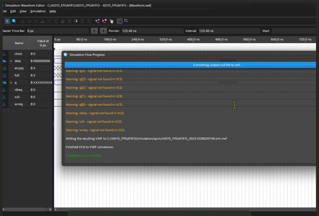 Hi, I am currently using Quartus Prime Lite 24.1 and the 10M02M153C8G device to implement an 8Kx9 SYNC FIFO. I generated the design directly using the IP CORE. Initially, my tests successfully produced output waveforms. However, I must have changed a setting unintentionally, as I am now unable to simulate the output. Even previous projects that worked before are no longer producing any waveforms. I subsequently observed the following messages in the Simulation flow progress: Warning: sclr - signal not found in VCD. Warning: wrreq - signal not found in VCD. These warnings are appearing for multiple signals, as shown in the image or attachment (referring to the image/attachment). I have already tried reinstalling the software and updating the license options, but the issue persists. Could you please advise on the cause of this problem and how to resolve it? Thank you for your assistance.118Views0likes10Comments